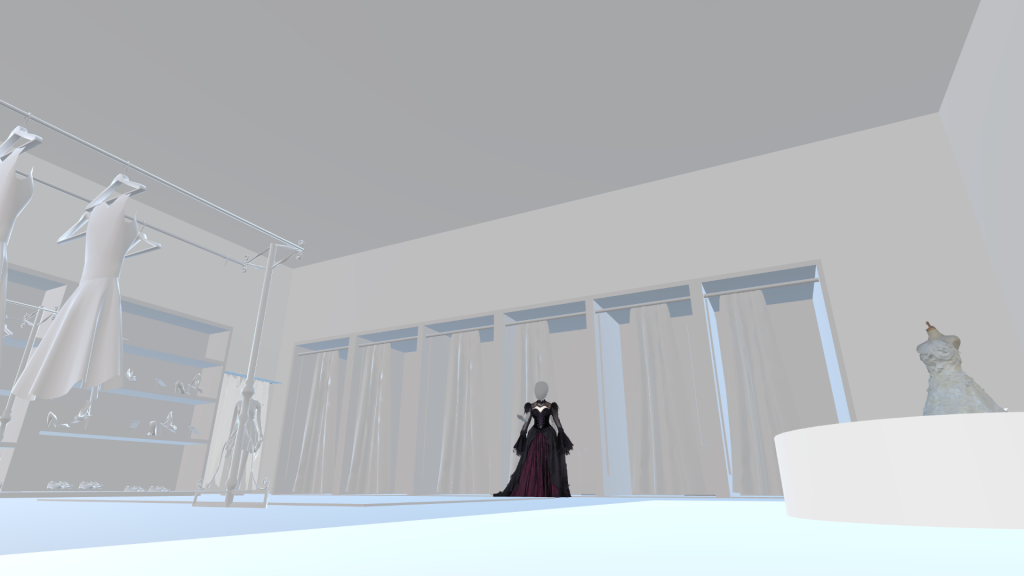 Scene2/ The montage shot is done in a way where the mannequin chases the bride. After the bride excitedly introduces the image of the wedding she envisioned, the mannequin steps forward and erases parts of the image, replacing them with a more traditional style (one that the bride’s mother prefers).